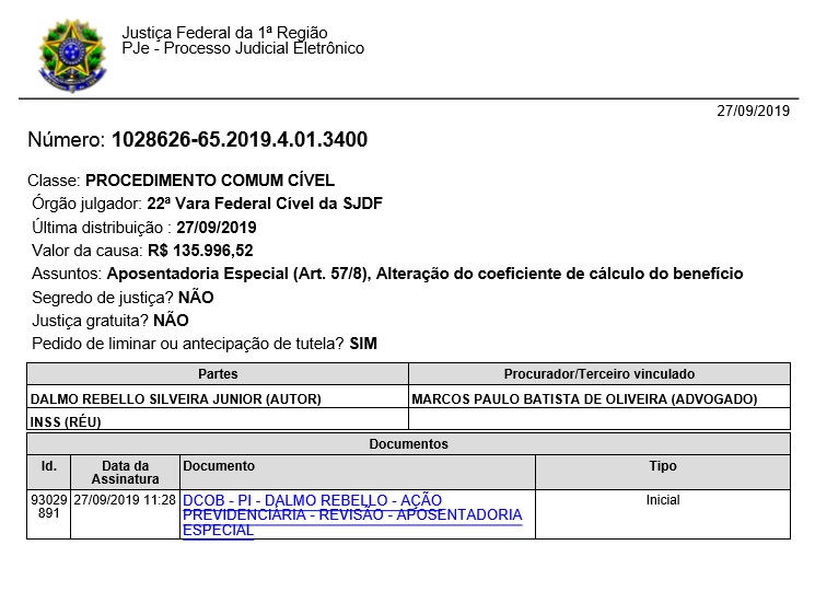 4.3 – Ação Previdenciária – Procedimento Ordinário – Revisão de Aposentadoria – Direito Previdenciário – 22ª Vara Federal da Seção Judiciária do Distrito Federal – Processo nº 1028626-65.2019.4.01.3400 – Data 27/09/2019.