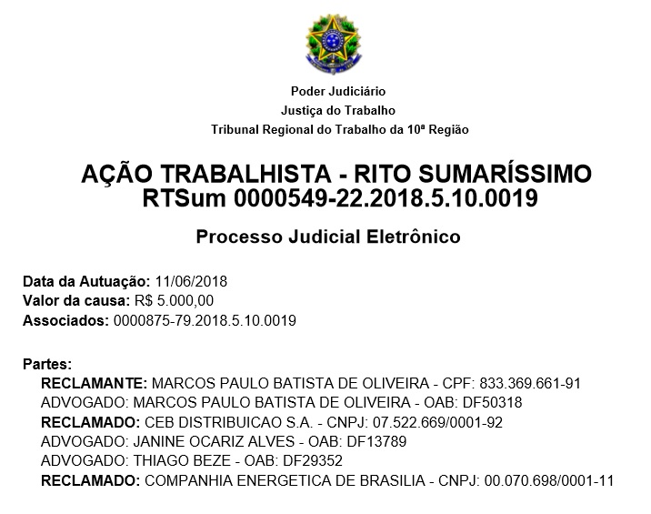 3.8 – Reclamação Trabalhista – 19ª Vara do Trabalho de Brasília – Quota de preenchimento – Processo RTSum nº 0000549-22.2018.5.10.0019 – Data 11/06/2018.