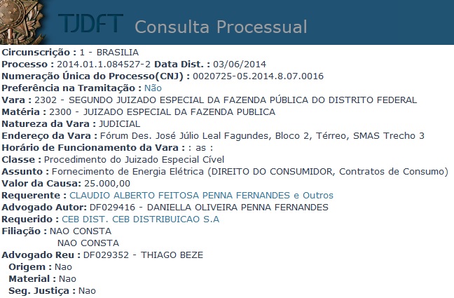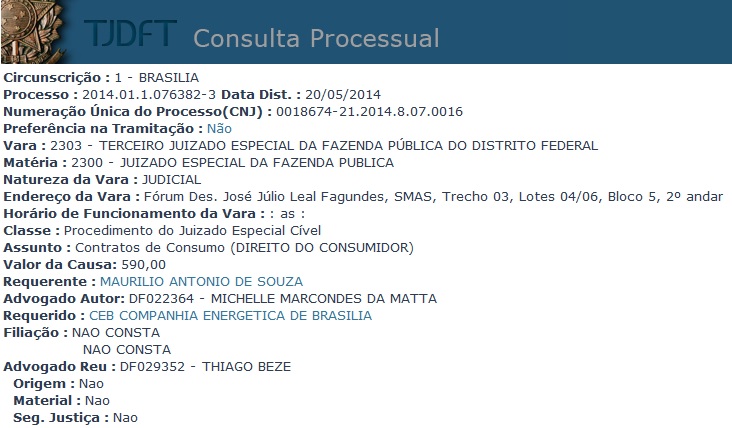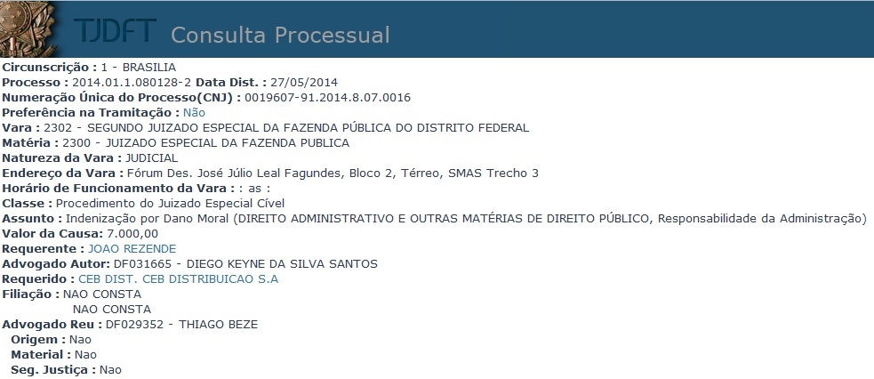 – Hoje fiz a leitura e análise dos três processos abaixo, para fins de preparação para as respectivas audiências, sendo estas agendadas para os dias 19.08, 20.08 e 05.09.14. Todos versam sobre ações de indenização advindas em função de pretenso distúrbios provocados pela prestação do serviço de fornecimento de energia elétrica pela CEB Distribuição S/A.