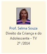 SELMA SOUZA – Direito da Criança e do Adolescente: Apesar de ser uma cadeira oferecida somente no último semestre do curso, optei por antecipar esta matéria, principalmente por ser um conteúdo frequentemente cobrado na maioria dos concursos (igualmente na primeira fase da OAB). A professora Selma, sem nenhuma dúvida tem um domínio completo da matéria, tendo inclusive atuado por diversos anos, como Membro do Ministério Público, na Promotoria da Infância e Juventude, o que proporcionou o enriquecimento das aulas com casos reais e experiências vividas quando da análise e condução de infrações cometidas por este público especial. Talvez as aulas merecessem um pouco mais de dinamismo, uma vez que se resumiram na projeção de apresentações no quadro, acompanhada da respectiva explanação. A turma não demonstrou muito interesse, talvez em função de ser o último semestre e, consequentemente, a maioria estar mais preocupada com a prova da OAB e a tão temida banca de monografia. As provas foram relativamente tranquilas, sendo que a última foi autorizado a resposta em grupo, por se tratar de estudo de caso e abordar toda a matéria ministrada. Ao final do semestre a professora Selma foi indicada e nomeada pela presidente da República, como vice-procuradora geral do MPDFT. Nossos parabéns!