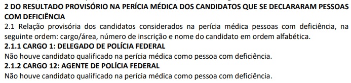 Na semana passada o Centro Brasileiro de Pesquisa em Avaliação e Seleção e de Promoção de Eventos (Cebraspe) divulgou o resultado final da perícia médica para os candidatos com deficiência do concurso público da Polícia Federal (PF). Os únicos cargos que constam no documento são os de agente e delegado (apesar de haver mais cargos com vagas para PCDs no concurso), e, em ambos, nenhum candidato PCD foi aprovado. Ao todo, o concurso contou com 1.757 PCDs inscritos, a maioria concorreu justamente aos dois postos: as nove vagas reservadas para agente foram disputadas por 981 candidatos com deficiência, e as oito vagas para delegado foram disputadas por 227 inscritos. Eles já haviam passado por diversas fases da seleção, como prova objetiva e discursiva, testes de aptidão física e avaliação médica.