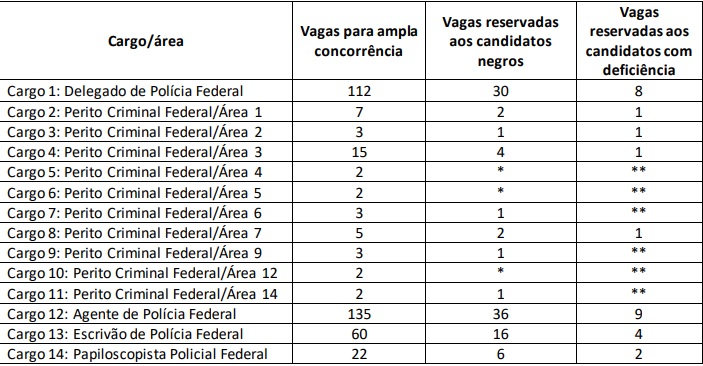 O concurso oferece ao todo 500 vagas, sendo 150 são para delegado, 60 para perito criminal, 180 agente, 80 para escrivão e 30 para papiloscopista. Os salários iniciais vão de R$ 11.983,26 e R$ 22.672,48, para jornadas de trabalho de 40 horas semanais. De acordo com o Cebraspe, 147.744 candidatos se inscreveram no concurso da Polícia Federal. O cargo com o maior número de inscritos foi o de agente de polícia, com 92.671 cadastros, seguido pelo cargo de delegado, com 17.816 participações. As lotações serão para os estados do Acre, Amapá, Amazonas, Mato Grosso, Mato Grosso do Sul, Pará, Rondônia, Roraima e Tocantins e em unidades de fronteira.